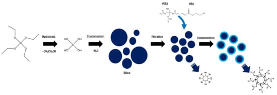 In this study, a nano-silica-core multifunctional acrylate (NSC-MF acrylate; Nano Polychem, Daejeon-si, Korea) was prepared by directly replacing the surface of nano-silica with acrylate. To prepare nano-silica particles from TEOS, a sol-gel method was used. In the manufacturing process, the size of the nanoparticles is 10–200 nm. As the size of the filler material increases, an optical disorder phenomenon occurs in the visible light/UV region. Here, particles with a size of 20–30 nm were selected through pressure filtering. To modify the nano-silica, briefly, a condensation reaction was used to directly attach acrylates on the surface of prepared pure silica. Two acrylates, 2-hydroxyethyl acrylate (2HEA) and pentaerythritol triacrylate (PETA), were used in this experiment (Figure 2). The condensation reaction with the hydroxy group of 2HEA/PETA was carried out using the hydroxy group present on the surface of the refined silica. In general, one-pot method using TEOS and acrylate silane at one time is also used to make acrylate-introduced silica on the surface [33]. In this study, we have selected this method to improve the compatibility in the blending process and to control the viscosity in the silica dispersion process. A composite resin was then prepared using NCS-MF acrylate and its shrinkage measured as well as the effects of compositional variation on its properties. Similarly, Micure HP-8 was used as a photoinitiator.
