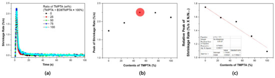 Figure 4 shows the contraction rate (%/s) calculated based on shrinkage evaluation. Figure 4b shows the maximum shrinkage rate, and the velocity is not proportional to the ratio of the two materials. However, the rate of shrinkage according to the ratio of the functional group of acrylate shows a completely different tendency (Figure 4c). As the content of TMPTA increases, the maximum shrinkage rate decreases linearly. The decrease tendency is very significant at the R2 = 0.998 level. The acrylate population of TMPTA (Mw: 289) is more than 1.93 times that of EO6TMPTA (Mw: 560). Therefore, the reaction rate of TMPTA should be measured higher if it has the same reactivity. The absolute reaction rate is high for TMPTA, but EO6TMPTA is relatively large for relative ratio. In addition, it shows the feature that the heat flow generated is increased while mixing the materials.