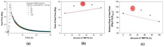 Heat flow of blending system: (a) real-time heat flow; (b) maximum heat flow of the binary monomer system (red circle: highest heat flow point); and (c) comparison of the relative value based on acrylate ratio.