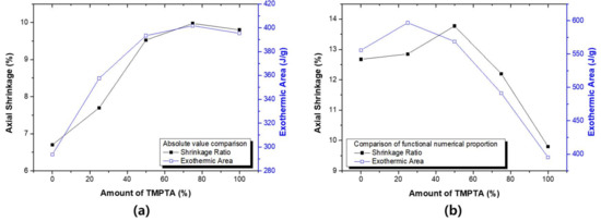 Comparative evaluation of the shrinkage ratio and the exothermic area: (a) comparison of the absolute value; and (b) comparison of the relative value based on acrylate ratio.