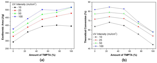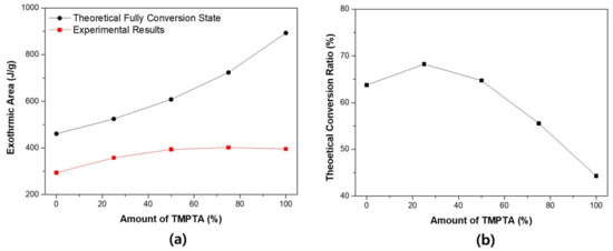 Photo-DSC can be used to measure the theoretical conversion ratio. When TMTPA and TMPEOTA are mixed, the population of acrylic functional group in the system are changed. Figure 7 shows the theoretical conversion ratio of photo-DSC. Figure 7a shows the theoretical calorific value at 100% conversion state of each system and the experimental measurement results of each system.