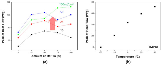 To investigate these effects, the curing behavior was investigated by varying the UV intensity. As shown in Figure 9, the curve changed as the UV intensity increased. Specifically, the reactivity of the TMPTA was confirmed to have increased sharply. The peaks for 100 wt. % TMPTA increased dramatically in proportion to the UV intensity, whereas EO6TMPTA (=TMPTA 0 wt. %) did not change significantly. Comparing TMPTA with EO6TMPTA, the molecular mobility of TMPTA is relatively low, since TMPTA has a higher Tg. As the reaction progresses, a portion of the TMPTA that is curing undergoes a sharp decrease in mobility. Eventually, only acrylate sites that do not participate in the reaction remain. Therefore, when EO6TMPTA is mixed with TMPTA, the latter’s unreacted sites can participate in the reaction continuously. In addition, as the intensity increases and the internal energy increases, the mobility of the molecules relatively increases, improving their reactivity. For this reason, there is a difference between the two materials in the amount of change of the peak reactivity upon increasing the UV intensity. These results are more apparent when the temperature-dependent photo-DSC results are observed. The Tg of TMPTA is about 62 °C. When the curing progresses partly to form a three-dimensional network, the Tg of the polymer corresponding to the portion continuously increases to reach 62 °C. Therefore, the farther the temperature of the peripheral part is from the Tg, the more rapidly the mobility decreases. The maximum response increases linearly with increasing ambient temperature from −50 to 50 °C. As the temperature increases, the flow rate of the material changes. Therefore, the reaction rate may increase. However, according to the results of Park et al. The material having a low specific Tg of the material tends not to change with temperature have [10]. As a result, Figure 9 shows that the difference in reactivity due to mobility can affect the mixed system of materials.