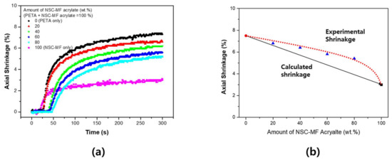 Shrinkage of the blended system of nano-silica-core multi-functional acrylate (NSC-MF acrylate) with PETA: (a) shrinkage over time depending on relative NSC-MF acrylate content; and (b) maximum shrinkage depending on relative NSC-MF acrylate content.