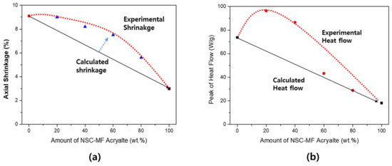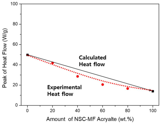 Figure 12 shows the photo-DSC results. First, the system with PETA revealed a mostly linear dependence, similar to the shrinkage tests. There were no significant differences in the blending characteristics compared to calculated values, because the PETA structure is similar to the surface-substituted structure of NSC-MF acrylate. Finally, no phase separation occurred between PETA and NSC-MF acrylate.