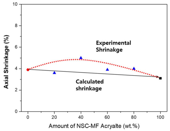 Figure 11 presents the results of the evaluation of the system with PETA blended with NSC-MF acrylate. Since mainly PETA was used to treat the surface of the nano-silica filler, blending between the two materials was excellent. As mentioned above, the nano-porous effect occurs if two materials of different sizes are mixed. Since NSC-MF acrylate has a very large molecular mass, PETA could fill the space between its molecules. Mixing PETA with NSC-MF is similar to increasing the proportion of silica not participating in the reaction with PETA. In addition, since the –OH groups of PETA interact with the surfaces of silica particles, the nano-porous effect cannot be expected. Therefore, as the content of NSC-MF increases, the shrinkage rate decreased linearly.