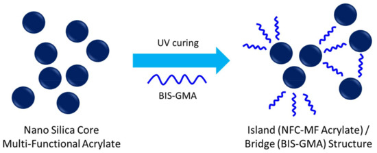 The same nano-porous effect between monomers and macromers was very large in the blended system with BIS-GMA (Figure 14), because island-bridge structures (schematically represented in Figure 15) could be formed due to the structural difference between BIS-GMA and NSC-MF acrylate; NSC-MF acrylate has a very large size with very low overall mobility, while BIS-GMA is a di-functional monomer with relatively low viscosity. The latter could improve the flexibility and consequently induce reactions between the functional groups.