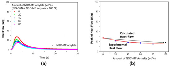 Heat flow of the NSC-MF acrylate and BIS-GMA blended system: (a) real-time heat flow; and (b) maximum heat flow of the blended system.
