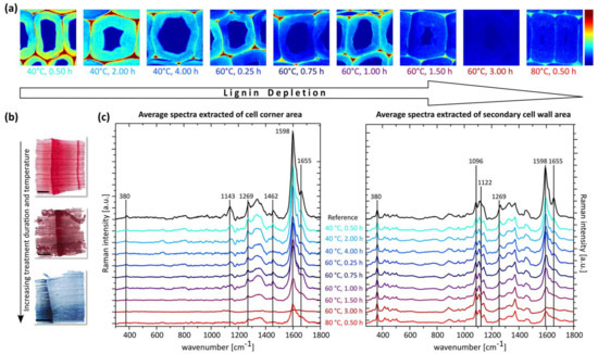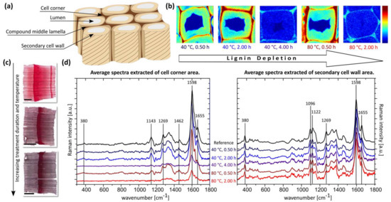 In contrast, for the acidic bleaching procedure the decrease of the main lignin vibration at 1598 cm−1, observed in the secondary cell wall, was strongly correlated with increasing temperature and treatment duration. Therefore, a gradual depletion of aromatic compounds is concluded (Figure 2c). The continuous removal of aromatic species is further confirmed by the constant reduction of the band at 1269 cm−1, a marker for the prevailing monomeric unit in softwood lignin and the decrease in intensity of the peak at 1655 cm−1, which is assigned to unsaturated C=C double bonds, a relative measure for lignin crosslinking density.