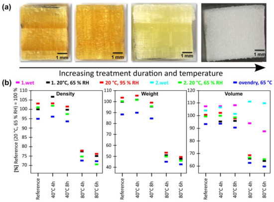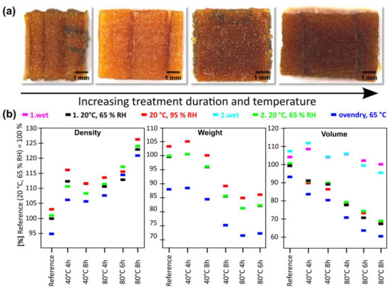 Characterization of acidic bleached spruce wood cubes. (a) Light microscopy images of the acidic bleached cubes of spruce wood. (b) Relative density variation, weight loss and volume changes for acidic bleached samples treated under different conditions and monitored under the influence of changing climate conditions (colour coded).