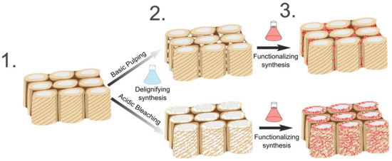 A common limitation for functional materials based on native wood is that it is difficult to functionalize the very compact cell walls and therefore a strong functionalization often requires an insertion of modifying substances in the cell lumina. However, this goes along with an undesired increase in density. Hence, in order to reach an increased degree of functionalization under retention of the low density in the material, the additional phase has to be inserted into the cell wall or compound middle lamella. For an enhancement of the pore volume present in these structures chemical delignification processes adapted from pulp and paper industry are a promising approach. Rather recently, this concept was applied with subsequent delignification and functionalization for the development of transparent wood [15,16,17].