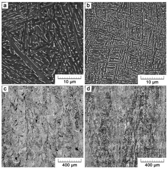 Figure 3 displays microstructures of Ti6Al4V alloy that was manufactured by the additive technology. Figure 3a,c belong to a part manufactured by SLM, the remaining two to an EBM part. For both parts, the microstructure exerts similar lamellar morphology consisting of thin α-lamellae (dark) that are separated by a small amount of interlamellar β phase (bright). In lower row of micrographs obtained at a lower magnification, long columnar grains can be distinguished. These are prior-β grains growing across several layers in an epitaxial manner. In EBM, prior-β phase within these grains transforms into a lamellar mixture of α+β during cooling. Owing to the high cooling rates in SLM (up to 106 K/s [14]), martensitic needles are formed in the as-built specimens. Nevertheless, after the application of post-process heat treatment at 1093 K below the β transus, these martensitic needles decompose into α+β lamellae. In Figure 3c, also some porosity can be noticed. Nevertheless, a very good relative density higher than 99.5% was achieved. Results of the porosity assessment are summarized in Table 1.