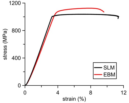 Exemplary stress-strain curves for EBM and SLM tensile specimens.