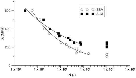 Figure 6 shows S-N curves for Ti6Al4V that were manufactured by both additive technologies, EBM and SLM. The curve for SLM is positioned above the EBM curve reflecting that the SLM material exerts a higher fatigue life. The fatigue strength of the SLM material is 220 ± 24 MPa, while 115 ± 13 MPa for EBM.