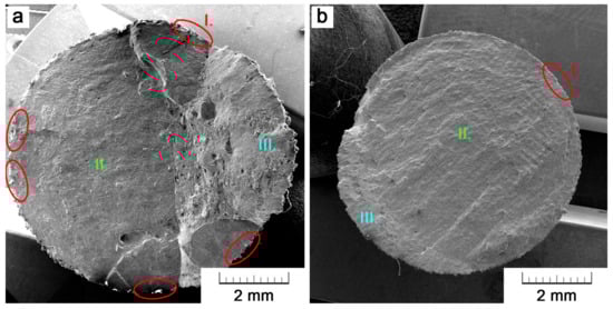 Comparison of fatigue fracture surfaces of (a) EBM and (b) SLM specimen. Areas I. (in red) represent initiation sites, II. represent areas of fracture propagation (in green) and III. is the final fracture area (in blue).