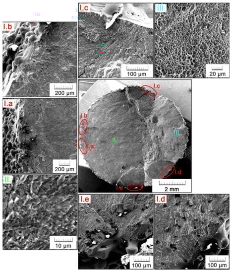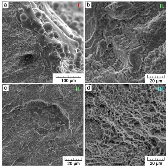 The fractographic analysis of the EBM specimen is depicted in detail in Figure 8. Five main initiation sites are represented by surface irregularities, manifesting in a notch effect (Figure 8I.a–e). Areas that are adjacent to the location of crack initiation are contaminated by dust and other particles, which penetrated into the crack entry during the tensile component of cyclic loading. In Figure 8I.a, a typical flabellate propagation of the fatigue crack can be observed. The area of crack propagation is further magnified in Figure 8II. A fragile fracture nature is evidenced. Also, characteristic ‘beachmarks’, formed as a result of cyclic loading when the crack opens and propagates only in periods of tensile stress action, can be distinguished. Figure 8III. shows the final fracture area, which, contrarily to the fatigue fracture, exerts a clearly ductile nature with a fine dimple morphology.