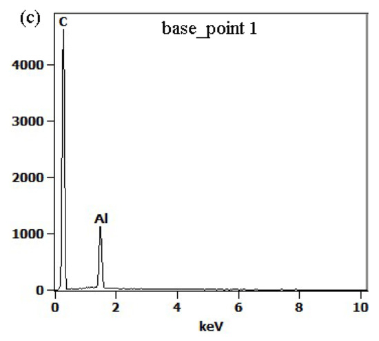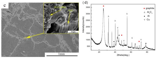 Normally, molten Cu and the carbon matrix are not easily wettable at high temperature and under vacuum. Nevertheless, as seen from the EDS scanning analysis, molten copper penetrated well into the matrix because of the existence of Al4C3 (Figure 9a,b and Table 3). In summary, the conductive phase of the composite material consisted of two parts, namely, a matrix for forming material with the overall conductivity of the carbon-based conductive phase, and the network-like distribution of the metal conductive phase.