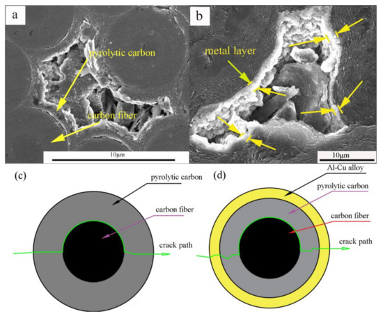 In general, the microstructure of a material determines its macro-performance. For C/C composites, the pyrolytic carbon completely coated the carbon fibers. First, in the process of infiltration, the formation of carbide increased the bonding strength between the pyro-carbon and the Al−Cu alloy. The adhesive strength between the pyrolytic carbon matrix and Al–Cu alloy increased when the pyrolytic carbon was coated with Al4C3 particles (Figure 11a,b). Second, the Al–pyrolytic carbon systems produced Al4C3 at the end, and the interface reaction product promoted wetting (Figure 11c). Finally, the C/C–Al–Cu composites showed excellent mechanical properties when compared with the pure C/C composites.