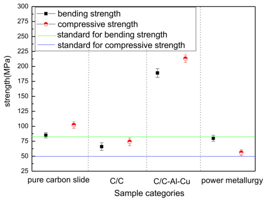 Compared to the bending fracture of the C/C composite material, C/C–Al–Cu materials with fiber lengths at the micron level showed that carbon fiber debonding left cracks or holes as shown in Figure 3b. In the extraction of the carbon fiber surface, the pyrolytic carbon and aluminum–copper alloy were visible, indicating that the aluminum infiltration enhanced the bonding strength between the pyrocarbon and Al–Cu alloy. As the interfacial bonding strength of the aluminum and carbon was restricted, the carbon fiber in the process of viscous resistance was limited, resulting in the pullout of short carbon fibers [18]. The difference in interfacial bonding strength between C/C and C/C–Al–Cu was due to the excellent wettability of aluminum and the improved strengthening effect of the matrix, thereby resulting in enhanced fracture stress. However, as shown in Table 2, the flexural strength of the pure carbon slider was only 85 MPa, whereas that of C/C–Al–Cu was 189 MPa (loaded in the Z-direction). From Figure 3c, the fracture surface exhibited brittle fracture behavior, and only a small quantity of the graphite particles of the matrix was displayed. The results exhibited the poor bending property of the pure carbon slide. Compared with industry standards (Table 1), the flexural strength of the pure carbon pantograph exceeded 80 MPa, whereas the C/C–Al–Cu composite satisfied the requirements for pantograph sliders [19,24,25,26]. In Table 2, the compressive strength of C/C–Al–Cu was 213 MPa, whereas that of the pure carbon slide material was only 102 MPa. Finally, C/C–Al–Cu exhibited better mechanical properties than the pure carbon slide.