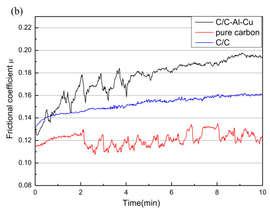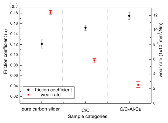 In Figure 6a, the average friction coefficient of the pure carbon slide composite was 0.121, whereas the friction coefficient of the C/C composite was 0.152. When the aluminum–copper alloy infiltrated the C/C composites, the friction coefficient increased from 0.152 to 0.175. The average wear rates of the C/C, C/C–Al–Cu, and pure carbon slide composites were 5.82 × 10−7 mm3/Nm, 2.56 × 10−7 mm3/Nm, and 12.32 × 10−7 mm3/Nm, respectively. During the friction processes, the pure carbon slide material could easily form a lubricating film because of the absence of the supporting role of carbon fiber and the large actual contact area. When the alloy liquid infiltrated the carbon matrix to fill the abundant defects, an important skeleton support was formed. Thus, the point-to-face contact pattern was easily obtained during the rubbing process, leading to the improvement of surface hardness, wear resistance, and friction coefficient [31].