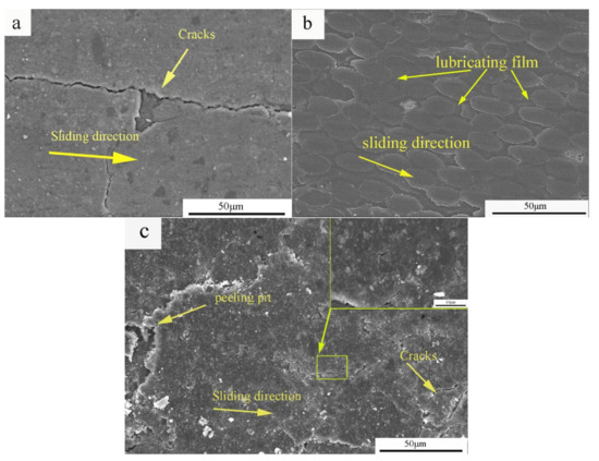 The materials between the worn surface and microcracks were peeled off, and peeling pits were formed (Figure 7c). Moreover, mechanical and thermal stresses were continuous between the contact asperities under constant load, showing localized fatigue phenomena related to the displacement of areas. The cyclic fatigue phenomena induced the generation of peeling pits in the material. When the alloy infiltrated the C/C composites, the lubricating film contained metal particles. Some metal particles increased the hardness of the lubricating film, and other metal particles fractured or were loosened from the matrix. Accordingly, abundant large wear debris was scattered on the worn surface, contributing to severe abrasive wear [19,24]. Furthermore, several peeling pits and cracks were observed on the worn surface, suggesting an adhesive wear mechanism.