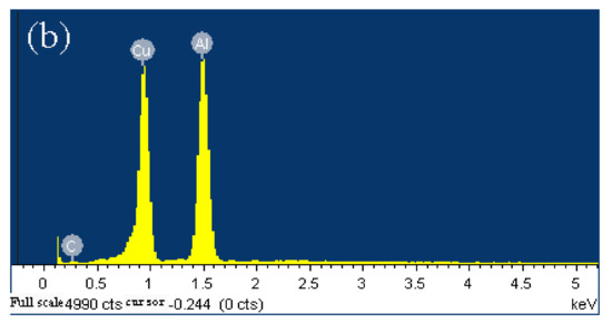 As seen in Figure 8a, the continuous and uniform electrical network of the Al–Cu phase formed in the composite, and the electrical resistivity of the composite was lower than that of the strips for current collectors currently used in railways (29.5 μΩm, CY280). Hence, a continuous electric network of the Al–Cu phase can form, thereby explaining the decrease in the electrical resistivity value when compared with that of the pure C/C composites.