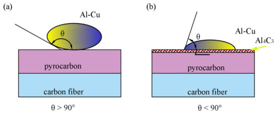 For the C/C–Al–Cu composites with carbides at the interface, the formation of carbides consumed the elemental C of the carbon fibers, leading to the transformation of interfacial bonding from mechanical to chemical bonding. The wetting behavior mechanism should be analyzed. These results were consisted with the previous reports [37,38,39]. In Equations (7) and (8), θ is the wetting angle, and the equilibrium value of the contact angle θ, which is used to define the wetting behavior of the liquid, obeys the classical Young equation [40]. In this article, the Al–pyrolytic carbon systems produced a small quantity of Al4C3 at the end, and the interface reaction product decreased the wetting angle (θ < 90°) [41,42].