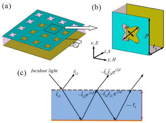 Furthermore, as shown in Figure 1a, the three-layer structure of the MMA is similar to a Fabry–Pérot resonance cavity, which can induce destructive and constructive interferences and finally result in multiple reflections and transmissions for the incident THz waves. Here, we can adopt the multiple interference theory analyze the absorption properties. As shown in Figure 1a, the multi-reflection interference model contains two interfaces: air–spacer with periodical CCOSG array, and spacer–substrate. In this design, the near-field coupling effect between the CCOSG sheet and ground plane can be neglected, since the thickness of the dielectric substrate is large enough. As shown in Figure 1c, when the incident THz wave enters the MMA, part is reflected at the CCOSG–air interface, and the other part emits from the interface after multiple reflections and transmissions. Thus, the overall reflection coefficient of the structure is expressed as follows [14]: