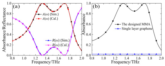 The numerical results of the proposed MMA with μc = 0.5 eV: (a) the simulated and calculated reflectance and absorbance of the designed MMA based on CCOSG sheet; (b) the simulated absorbance of the MMA based on CCOSG sheet and bare mono-layer graphene.