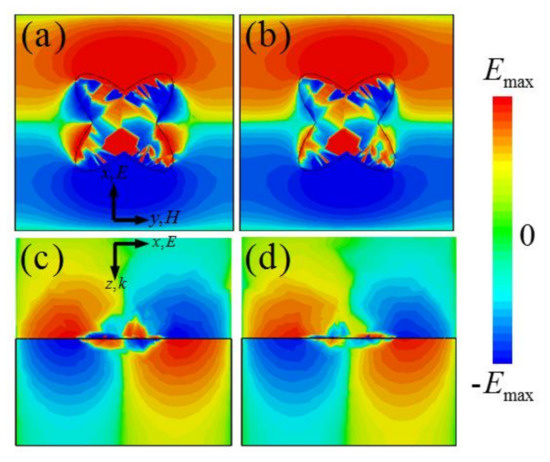To better understand the physical mechanism of the stronger absorption behavior observed in the broadband, the electric field (Ez) distributions of the x–y and x–z planes of the unit-cell structure at two resonance frequencies are investigated numerically. Figure 3a,b shows that the electric field (Ez) distributions mainly concentrate on the four corners of the CCOSG structure and the upper and lower sides of unit-cell structure. As shown in Figure 3c,d, surface plasmon polaritons (SPPs) are effectively excited at two absorption peak frequencies (f1 = 1.34 THz, f2 = 1.71 THz). Since strong absorption is obtained, kG is about equal to k0 and SPRs are excited between f1 and f2. In addition, it can be observed that fundamental and second-order SPR are effectively excited at two resonance frequencies. Furthermore, since the dielectric substrate is loss-free and incident light is less absorbed by a single-layer graphene sheet in a broadband range, it can be conjectured that the strong SPRs noticeably enhance the absorption efficiency of the CCOSG structure of this MMA. However, there is a small difference in the field distributions for two resonance frequencies. Compared with the first resonance frequency, the fundamental SPR is slightly suppressed by the second-order one at the second resonance frequency.