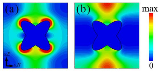 To further understand the absorption mechanism, we give the power loss density distributions of the x–y plane on the CCOSG surface at two absorption peak frequencies when μc = 0.5 eV, as shown in Figure 4. For the first absorption peak, as shown in Figure 4a, the THz energy is mainly dissipated at the four corners of the CCOSG structure, meaning that the absorption is principally based on fundamental SPR. However, as shown in Figure 4b, there are power losses at the upper and lower edges of the unit-cell structure at the second resonance frequency. The absorption mainly originates from excitation of second-order SPR at the second absorption peak. Thus, the loss density distributions further illustrate that the broadband absorption of this designed MMA is based on effective excitation of the fundamental and second-order SPRs.
