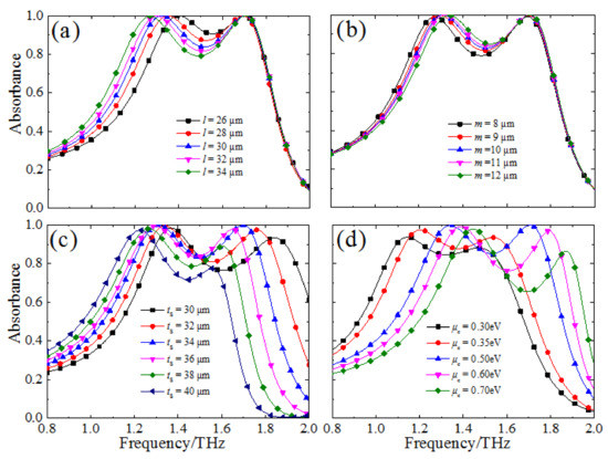 Taking things a step further, we also study the resonance absorption properties of the designed MMA with different geometric parameters for the unit-cell structure and chemical potential (μc). As shown in Figure 6a, when the long radius (l) of the CCOSG structure increases from 26 to 34 μm, the strong absorption bandwidth is extended and the absorption level at the central frequency is gradually decreased. In addition, the first absorption is red-shifted from 1.4 to 1.27 THz and the second absorption peak is basically unchanged. Meanwhile, the proposed MMA maintains perfect absorption at two resonance frequencies. However, the case is much different for the short radius (m) of the CCOSG structure, as shown in Figure 6b. When m increases from 8 to 12 μm, the strong absorption bandwidth becomes narrower and the absorption level gradually increases at the central absorption frequency. In addition, the first absorption peak frequency is slightly blue-shifted from 1.27 to 1.34 THz, but the second is nearly unchanged. Similarly, the absorption level also achieves 99% at two resonance frequencies. It should be noticed that only the first resonance frequency is affected by changing l and m, since the incident THz wave energy is mainly dissipated at the four corners of the CCOSG structure at the first resonance frequency (see Figure 4a). Considering that the first SPR is localized at the four corners, the dispersion relation can be approximated for the localized SPR, which is matched with the simulation results [46]. The second SPR, which is excited in the graphene sheet with no gap, is nearly unchanged with different l or m. Based on SPRs in unstructured graphene sheets, the second SPR frequency is relative to μc [38]. Thus, the first resonance frequency and bandwidth are dynamically modulated by tuning the l or m value of the CCOSG structure.
