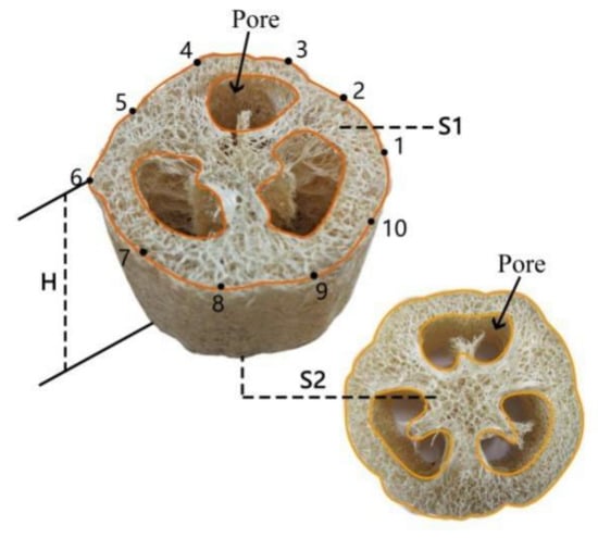 where ρ is the density of a LS column (kg m−3), m is the mass of a LS column (kg), and v is the volume of a LS column (m3). S1 and S2 are the areas of the top and bottom transverse sections of a LS column (excluding the porous structure on the transverse section), respectively. The transverse section of an LS column and 10 observation points on the circumference are shown in Figure 2. The area is expressed in m2, while H, the height of LS column, is expressed in m.