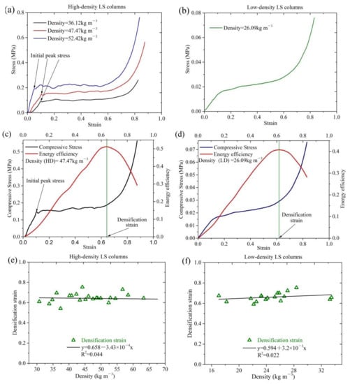 The mechanical properties of the two types of LS column: (a) the stress–strain curves of high-density LS columns, (b) the stress–strain curve of low-density LS columns; (c,d) illustration of the densification strain method; (e) densification strain of high-density LS columns; and (f) densification strain of low-density LS columns.