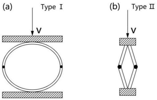 Figure 5a demonstrates that the surface of the LS columns becomes even more compact and their hoop wall bends to some extent when they are compressed to the plateau stage. However, when compressed to the densification stage, the surface of the LS columns becomes more compact and their hoop wall shows the appearance of greater bends. A comparative analysis of the compression processes of the two types of LS columns indicates that for the HD LS column, the first bend occurs in the middle height part of the hoop wall, and then in the top and bottom parts of the middle bend. Owing to the thick hoop wall, the HD LS fiber bundles in the inside part of the bending center undergo severe bending collapses, while the fiber bundles in the outer part of the bending center undergo a relatively small degree of collapse. During the compression process, the hoop wall of the LD LS columns bends with soft curvature, while that of the HD LS columns bends with steep curvature. This shows that the two types of LS columns have different energy absorption structures. The bending deformation of HD LS columns is similar to half of type II structure [14], as shown in Figure 6b. Type II structure has obvious initial stress peak point and is an inertial sensitive structure [31]. However, LD LS columns are similar to half of type I structure, as shown in Figure 6a, and the mechanical properties of type I structure are less affected by loading speed.