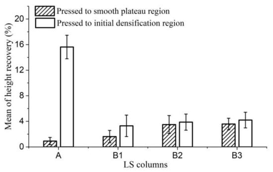Figure 7 shows the height recovery of LS columns compressed by 40% and 60% after being set in a humidity chamber at 20 °C and 65% RH for 24 h. The flexural fiber bundle has a certain ability to recover the original shape under the action of internal stress, which is rebound resilience [27,32]. The shape recovery of plenty of LS fiber bundles leads to some degree of height recovery of compressed LS columns. The height recovery of LS columns compressed to the densification stage is larger than that of LS columns compressed to the plateau stage. This is attributed to the fact that the deformation of LS columns compressed to the plateau stage is mainly due to the collapse of the cavities, while that of LS columns compressed to the densification stage is mainly due to further deformation of fiber bundles. Lower density of LS columns leads to higher porosity. When the LS column with higher porosity is compressed to the plateau stage, its deformation is dominated by the collapse of cavities, not the elastic deformation of fiber bundles. Thus, when LS columns arecompressed to the plateau stage, their height recovery increases with density.