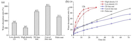 Figure 8b, Table 4 and Table 5 demonstrate that the water desorption of the two types of LS filling materials is significantly higher than those of 3D jute mats, carvel jute mats, and palm mats. After 13 h, the LD LS filling material exhibited the highest water desorption rate of over 91.44 %, and the HD LS filling material also showed a higher water desorption rate of over 76.86%. Nonetheless, the water desorption rate of carvel jute mats and palm mats were only 35.61% and 35.77% respectively, and that of 3D jute mats was only 18.06%. In addition, it took 48 h and 72 h for palm mats and carvel mats, respectively, when their water desorption rates reached 75%, while the water desorption rate of 3D jute mat only reached 57% after 72 h.