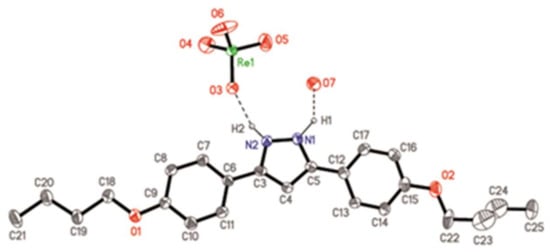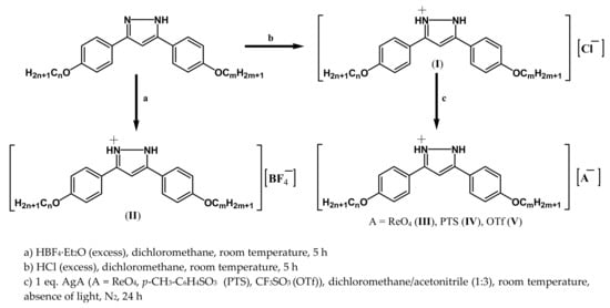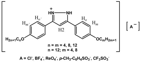 2.4. Preparation of 3-(4-Alkyloxyphenyl)-5-(4-alkyloxyphenyl)pyrazolium Salts of the Type ReO4-n,m (n = m = 4, 8; n = 4, 8 and m =12), PTS-n,m (n = m = 4, 8, 12; n = 4, 8 and m =12) and OTf-n,m (n = m = 4, 8; n = 4, 8 and m =12)
