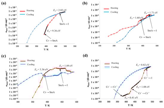 | Compound | EA (Solid) (eV) | EA (Mesophase) (eV) | σ460K (Ωcm)−1 |