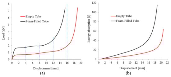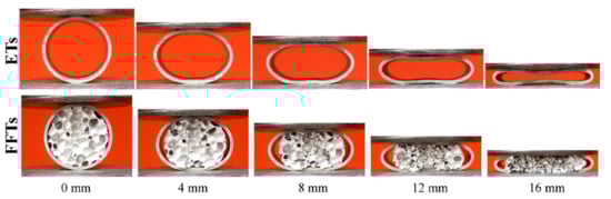 As can be seen in Figure 3 the thin-walled cylindrical ETs specimen presents a curved surface (between 8–16 mm displacements) under LL condition, while in the case of FFTs samples the non-deviated deformed plane surface of the ETs were observed that would be related to the energy absorption effect of closed-cell aluminum foams. The use of aluminum foam as a core material increases both the strength of the structure and its stability under compressive loads at elevated temperature, even despite the fact that the core foam within the FFTs at the initial stages of compression (4 mm of displacement) starts to be compressed and separate from the inner wall of the steel tube.