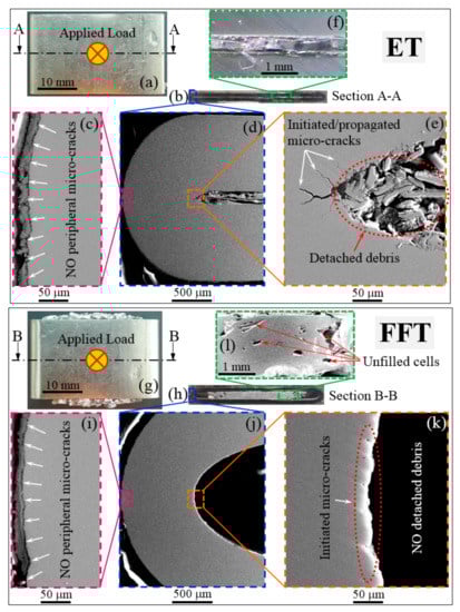 Macroscopic (a,b,f,g,h,l) and microscopic (c–e,i–k) images of initiated and propagated micro-cracks in ETs and FFTs specimens.