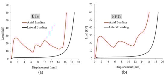 A comparison of axial and lateral load-displacement curves for both ETs (a) and FFTs (b) sample configurations.