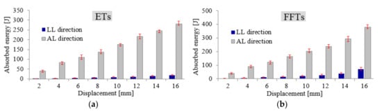 On the other hand, it was shown that the mechanical properties are significantly affected by the loading direction. Therefore, under AL direction, the absorbed energy is higher than that obtained for LL direction (up to 33 times for ETs and 14 times for FFTs).