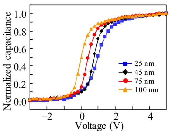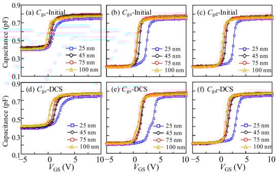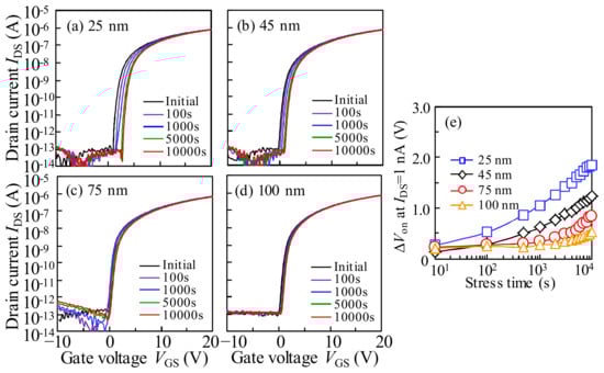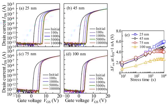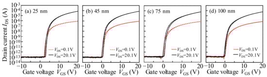 - Jeong, J.; Hong, Y. Debye length and active layer thickness-dependent performance variations of amorphous oxide-based TFTs. IEEE Trans. Electron Dev. 2012, 59, 710–714. [Google Scholar] [CrossRef]