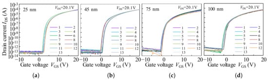 - Avis, C.; Hwang, H.R.; Jang, J. Effect of channel layer thickness on the performance of Indium–Zinc–Tin oxide thin film transistors manufactured by inkjet printing. ACS Appl. Mater. Interfaces 2014, 6, 10941–10945. [Google Scholar] [CrossRef] [PubMed]