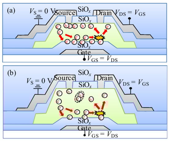 - Wang, D.; Hung, M.P.; Jiang, J.; Toda, T.; Furuta, M. Suppression of degradation induced by negative gate bias and illumination stress in amorphous InGaZnO thin-film transistors by applying negative drain bias. ACS Appl. Mater. Interfaces 2014, 6, 5713–5718. [Google Scholar] [CrossRef] [PubMed]
