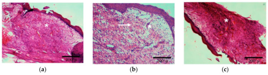 Histology of skin wounds in rabbits after 15 days of treatment. (a)Control: star—vascular granular tissue; (b)Ch/HA membrane: arrow—likely site of activated fibroblasts with formation of collagen fibres (it is acknowledged that a Masson trichrome or immunostaining is required to accurately identify these entities), star—newly-formed veins; (c)Ch/HA/MitoQ membrane: star—nonspecific granular tissue in the initial stage with enhanced cellularity.