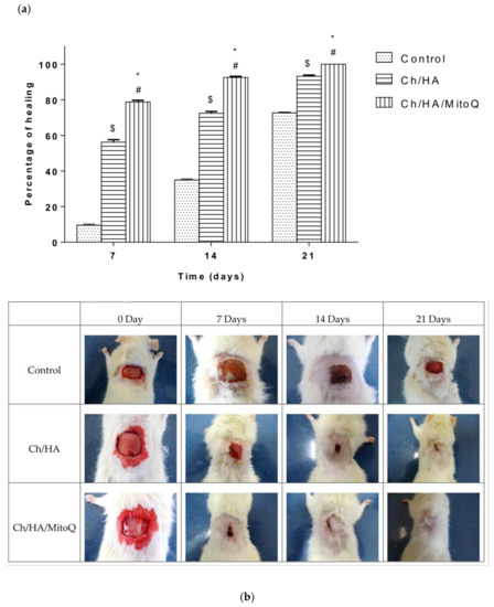 Profiles of the wound closures in rabbits, when the wound was not treated (control), the wound treated with the Ch/HA membrane and the Ch/HA/MitoQ membrane. The asterisk (*) indicates a significant difference at p ≤ 0.05 between the control and Ch/HA/MitoQ. The mark (#) indicates a significant difference between the Ch/HA and Ch/HA/MitoQ membranes at p ≤ 0.05. The mark ($) indicates a significant difference between the control and the Ch/HA membrane at p ≤ 0.05, n = 6 (a, b).