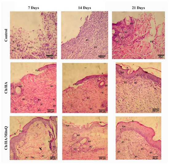 Histology of wounds treated with control (gauze), Ch/HA, and Ch/HA/MitoQ membranes at the 7th, 14th, and 21st day after the injury. Epi: Epidermis; K: keratinous layers; IC: possible site of inflammatory cells; BV: blood vessels; HF: hair follicles; SG: sebaceous glands.