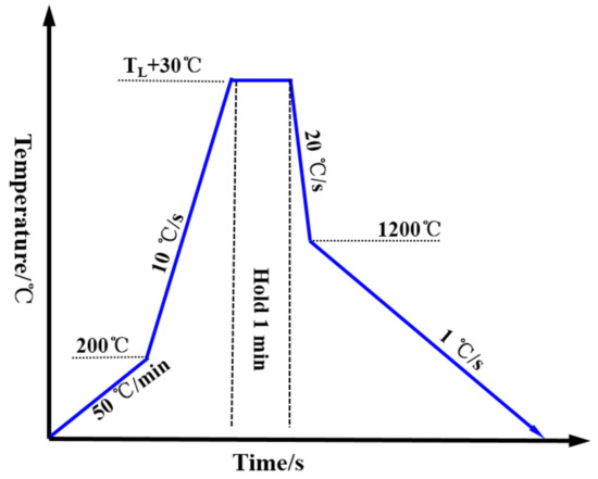 In the study, the sample size was a 7.8-mm-diameter cylinder with a height of 2.5 mm. Figure 1 is the thermal scheme. The sample was heated to TL+30 °C at first and subsequently held for 1 min, after which a quick cooling rate of −20 °C/s was applied to cool the samples to 1200 °C. Finally, the sample was cooled to room temperature with a cooling rate of 1 °C/s. The cooling air was high purity argon (6N) and a video was recorded at 20 frames per second during cooling. For the surface roughness measurement, the 3D surface morphology of samples were scanned, firstly by CSLM with the standard objective lens (×1000 magnification), then we manually choose the measuring region by “scoring a line” (the method for selecting the measurement line is described in Section 3.3.1) and the surface outline and surface roughness can be obtained automatically through the software. To ensure date reliability and result reproducibility, at least 15 different locations in 3 fields of each sample were measured to calculate the surface roughness.