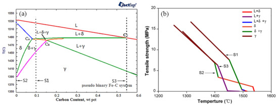 FactSage calculation of pseudo-binary Fe–C diagram (a) and the relationship between temperature and tensile strength during solidification (b).